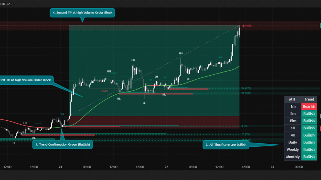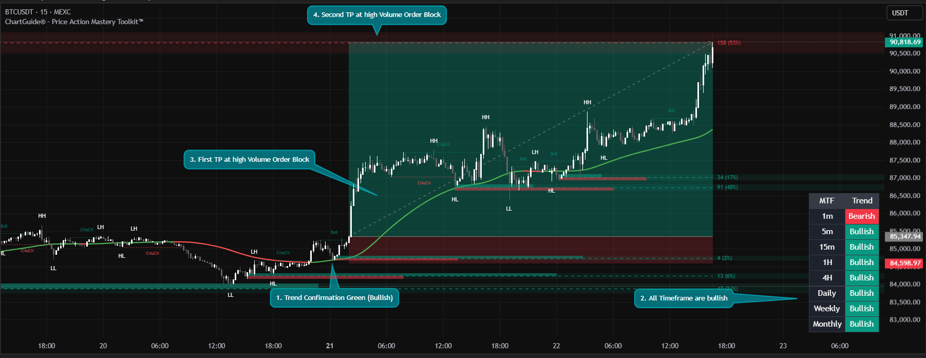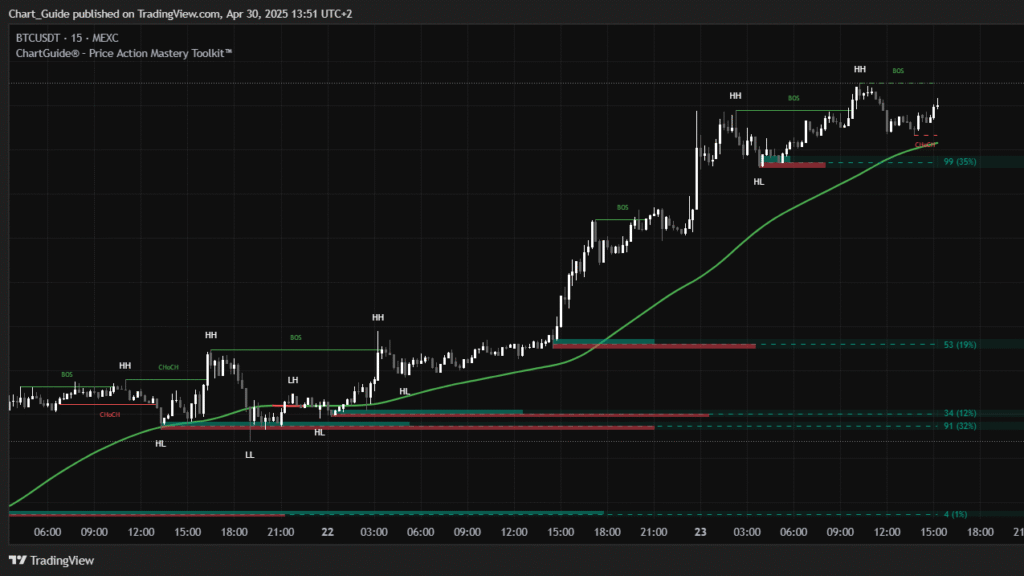 This all-in-one toolkit highlights BOS, CHoCH, HH/HL/LL/LH, fair value gaps (FVG), order blocks, liquidity zones, and multi-timeframe trends, giving you a clear view of how price moves and how Smart Money drives the market. Track market shifts, spot key reversal points, and understand trend direction across timeframes. Whether you trade crypto, forex, or stocks, this toolkit helps you navigate liquidity, trends, and market dynamics with confidence.