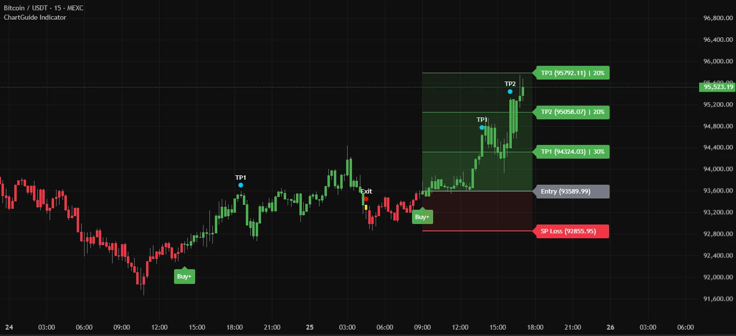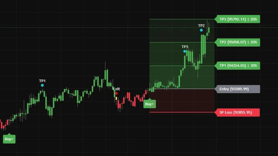 It provides simple buy and exit signals, multiple take-profit levels, and solid risk management all in one.